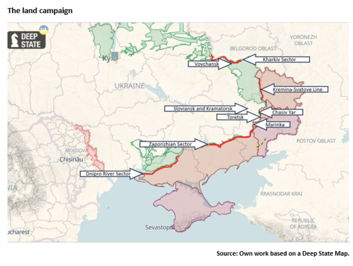 Ukraine’s attacks on Russia’s oil production and distribution networks are shown on the map in orange. The extent of these attacks is impressive, Ukraine consistently hitting targets across an arc of approximately 1500km, and deep within Russia. The campaign has a measurable impact on Russian oil production and distribution, reducing export revenue and increasing petrol prices in Russia.