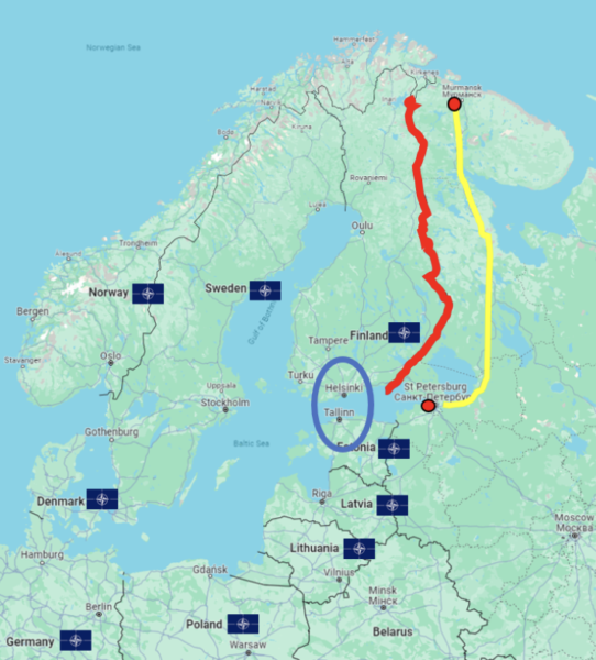 Map of the Baltic, showing NATO’s dominance of the region, especially with the inclusion of Finland and Sweden in the alliance. The red line is Finland’s border, the yellow line represents road and rail routes between Russian Arctic ports and Moscow. The blue circle indicates NATO’s ability to close the Gulf of Finland to Russian ships and submarines.