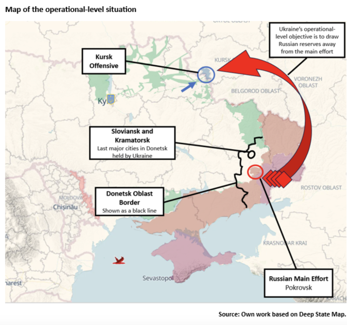 Ukraine responded to these activities by developing a plan to divert Russian resources and reserves away from this section of the frontline. This plan involved an attack across the Russian border into Kursk Oblast. The attack was sudden and successful, led by experienced and well-equipped Ukrainian units, factors that indicate it was well-planned. It is likely that this offensive is coordinated at operational-level with Ukraine’s defence of Donetsk and is part of the strategy of attrition described by General Syrskyi, immediately after his appointment. Essentially, by drawing Russian reserves away from battles in Donetsk, Ukraine is fixing Russian forces in defensive battles that will attrit them. By reducing it reserves, Russian withdrawal or manoeuvre becomes difficult for forces already committed to attacks. Russian forces that are stuck, or fixed and be targeted more effectively.