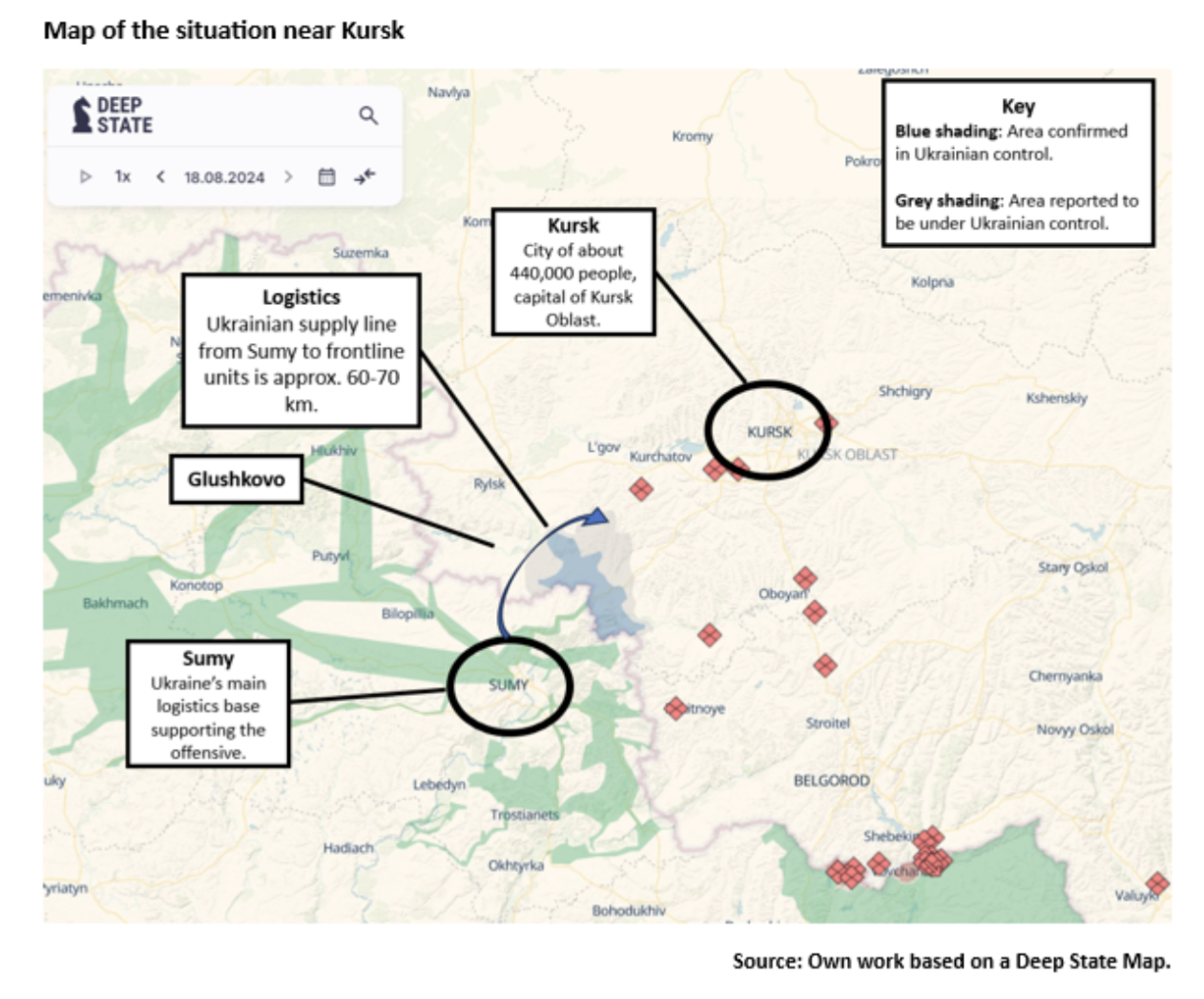 After two weeks of rapid advances, Ukraine’s forces are slowing down and appear to be expanding the base of the salient, seeking to create a defensible perimeter. On 15 August, Ukraine announced it has captured the border town of Sudzha. Although Sudzha’s population is only about 7,000 people it sits opposite Sumy on the Russian side of the border, and on the main road east to Kursk. Russian soldiers continue to surrender in large numbers and resistance is piecemeal and poorly coordinated. Additionally, Ukraine has broken another of Putin’s ‘red lines’ by crossing the border and the lack of an escalatory response will empower international supporters to release more aid.