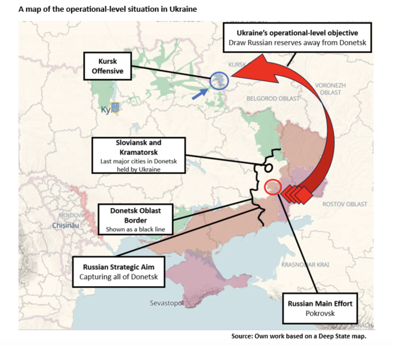 At operational-level the 300-km-long see-saw battle continues, Russia trying to capture all of Donetsk in the east, while Ukraine aims to draw forces away by attacking in the north near Kursk.