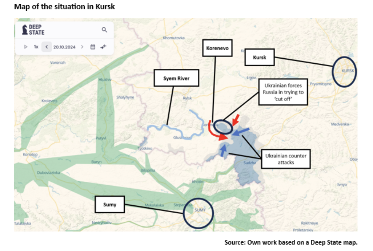 After making the spoiling attack, some Russian forces advanced east, aiming to meet up with a similar attack from the north to cut off Ukrainian soldiers near Korenevo. Since then, this battle has flowed back and forth, with Ukraine vigorously counter attacking.
