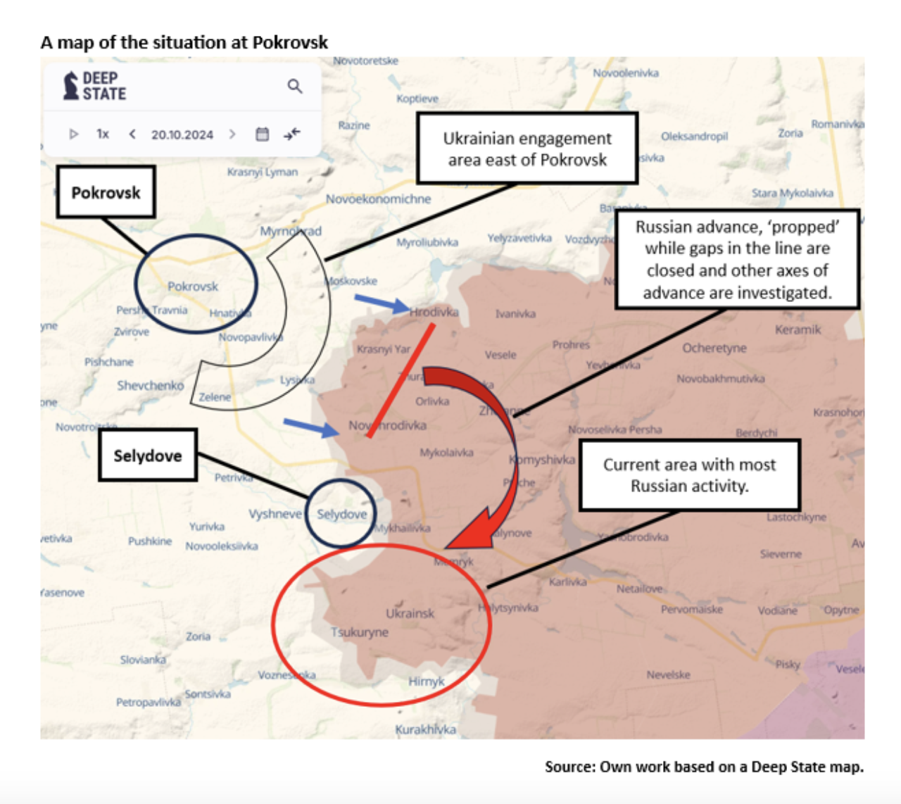 The fact that Russian forces are not moving west indicates that Russia does not have the resources to advance through the engagement area and take Pokrovsk. An assessment supported by recent successful local Ukrainian attacks near Hordivka and Novohrodivka, that were reported by the Institute for the Study of War on 17 October and confirmed by geo-located video footage. Successful small attacks in these areas demonstrate that Russian forces near Pokrovsk are tired and weaker than they need to be to advance on the town.