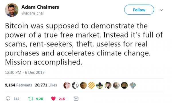 “Bitcoin is decentralised so there is no governing body controlling it or its developers and this is what normies are really bumping up against.”