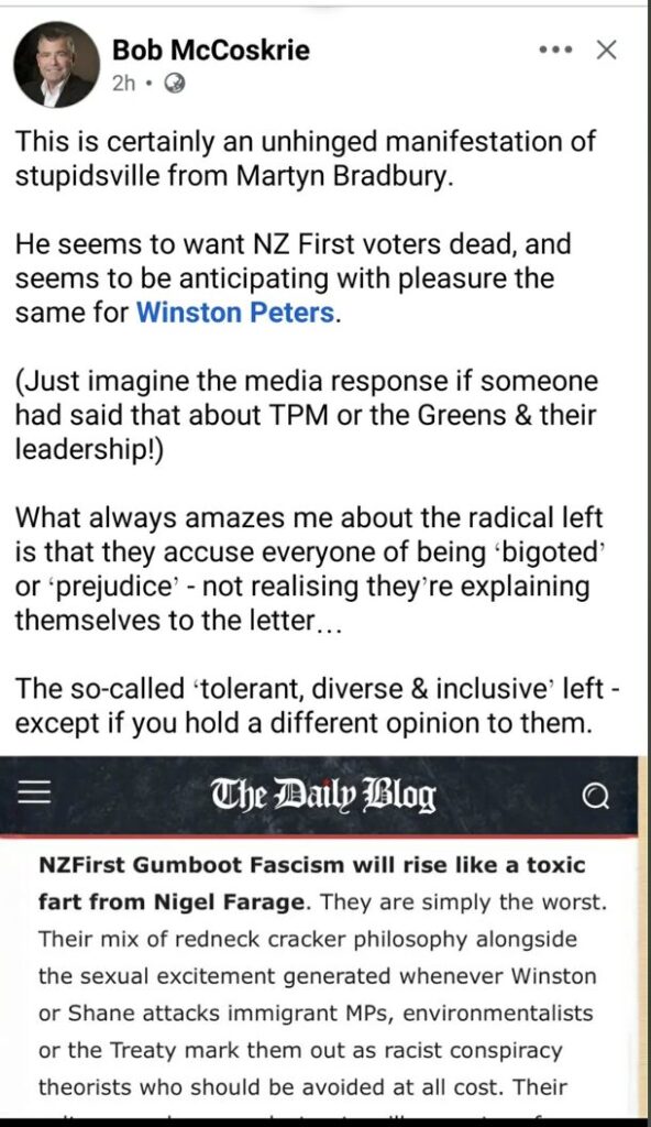 Far right christofascist Bob McCoskrie has attacked me as being violent and a disgrace to the Left for suggesting he and his ilk are vile…