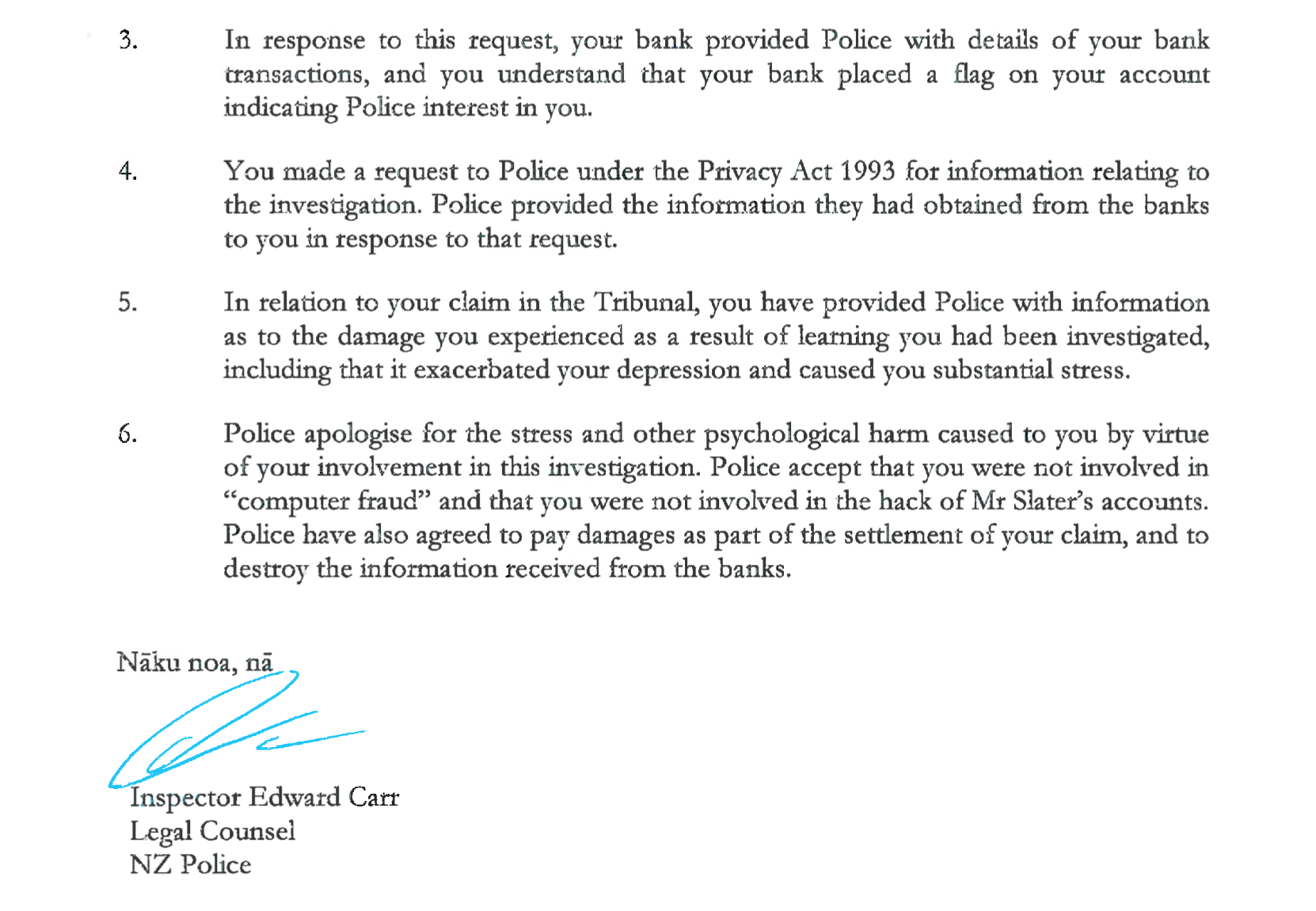 “Police apologise for the financial, reputational, stress, and other psychological harm caused to you by virtue of our unjustified actions that inappropriately involved you in this investigation.”