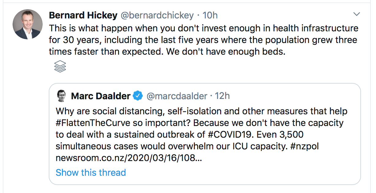 There are none so blind as those who cannot see. The counter to these arguments is that we haven’t applied enough neo-liberalism and to double down on it. Overall we still have less hospital beds in New Zealand than we did in the 1970’s to serve a much larger population. Some of this can be put down to some efficiencies in modern care, centralizing some services and privatizing elderly care. However much of it can be laid at the feet of tinkering with structures and cost savings. Lack of resourcing is reflected in the budget deficits being run by all DHBs. Naturally harsh economic medicine will again be applied to rein in this deficit which adds to a shocking total of well under 1% of the health budget. It is clear from the past two years that the government of the left we supposedly have does not associate the social and economic problems we have with the economic model we have followed. Thus we see it trying to deal with the symptoms in isolation of the causes or in many cases not proposing the correct solutions because of the threat of another winter of discontent from business and MSM. So maybe it is Realpolitik? It is to be hoped this crisis may prompt a reevaluation of where we are in NZ in terms of overseas dependence and returning to a more self sufficient economy that provides a better spread of positive outcomes to more of the population in general.