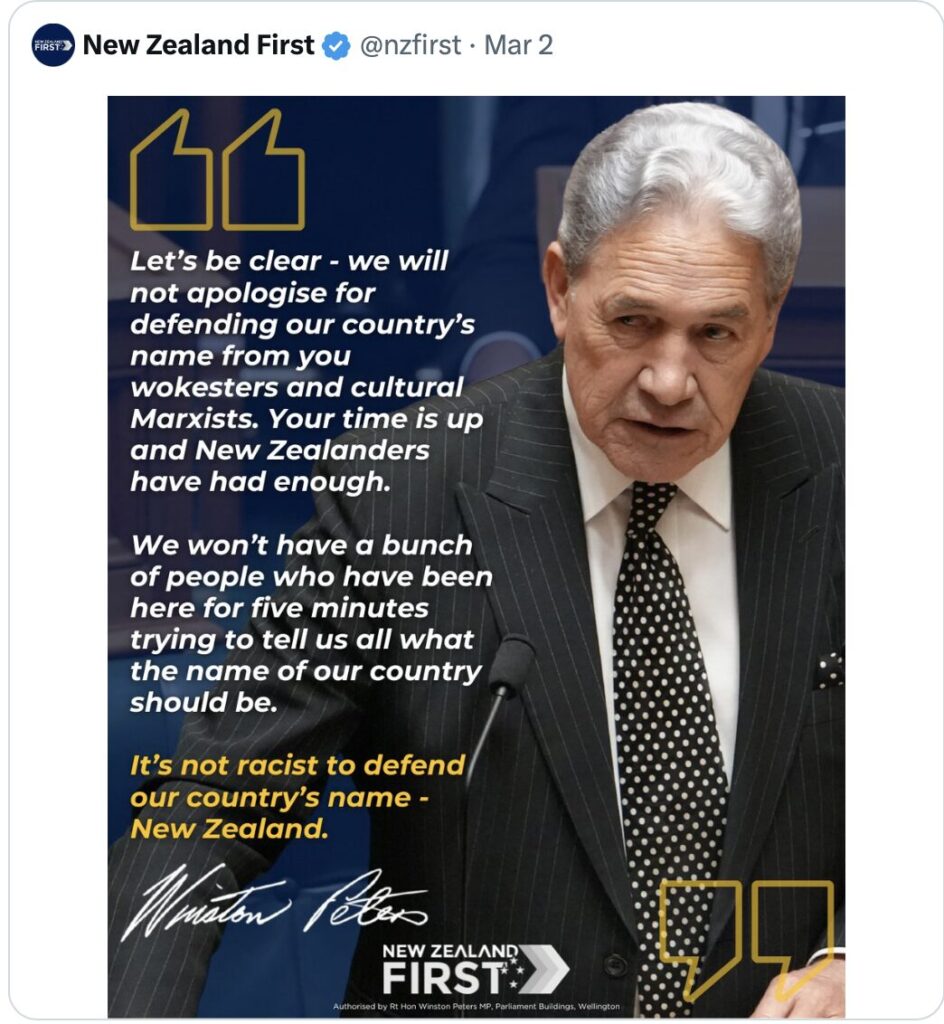 So Matua Winston is on the road to 15% with this toxic mix of culture war garbage and petty bigotry. If he leap frogs the Greens as the 3rd largest Party he will be kingmaker again and will demand 12months as Prime Minister from National and ACT or 18 months as Prime Minister with Labour (after they kill Chippy as leader).
