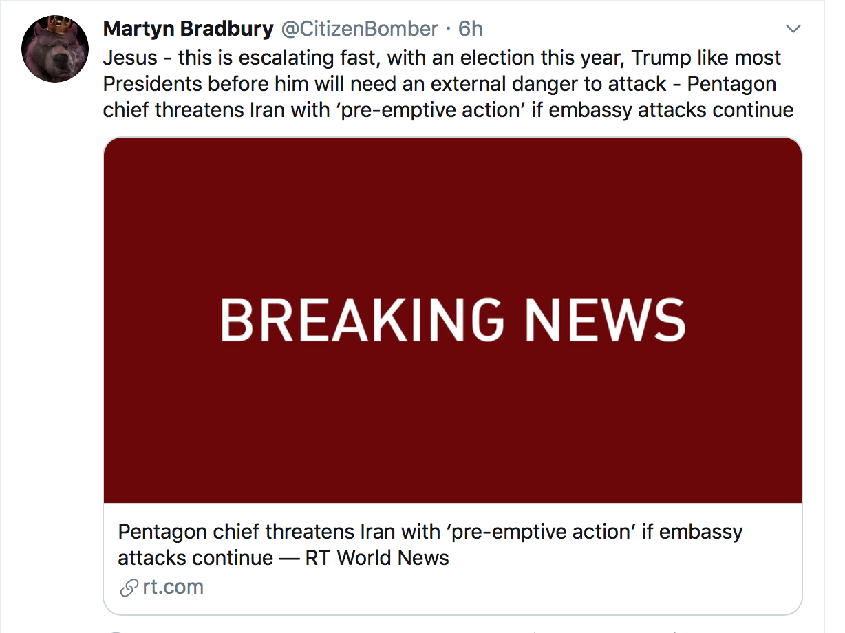 “I just filed a resolution to prevent Trump from starting a war with Iran. The President wants to pretend that Congress doesn’t exist, but it’s our clear Constitutional duty to debate and vote before allowing him to rush into an unnecessary war.” – Senator Jim Kaine – tweeted at 8.44 am 4th Jan.
