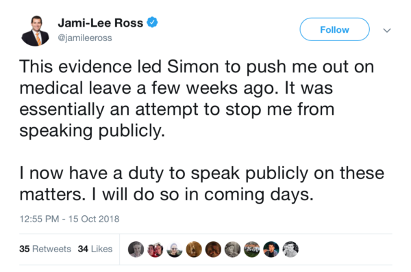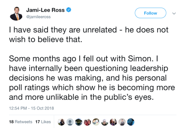 Hah, it was really the worst kept secret since Jamie Lee Ross – through Bridges – had announced he needed a few months sick leave, and Bridges even used the word ’embarrassing’.