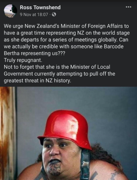 Is it ok for me to describe Ross Townsend as white trash ? New Zealand has gone overboard with ‘ cultural sensitivity’ issues aimed at obliterating our rich European heritage, and part of a global phenomenon being utilised for various agendas, but Townshend’s crude personal caricature of Minister Mahuta is ignorant racist misogynistic transferred violence, and the sort of thuggish bullying which we New Zealand women