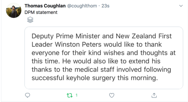 Deputy Prime Minister and New Zealand First Leader Winston Peters has been hit by symptoms of food poisoning and will be taking medical leave after having surgery this morning.