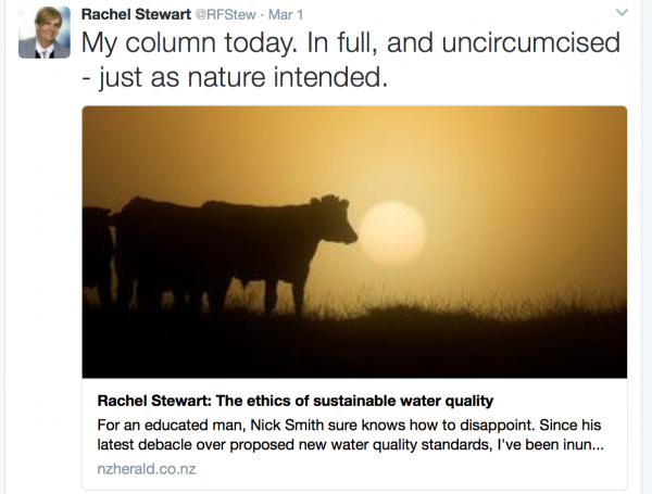The Rachel Stewart who has the courage to criticise Fonteera’s lies, DairyNZ lies, the Rachel Stewart who was threatened with rape by Federated Farmer members on twitter, the Rachel Stewart who uses her media platform to actually hold the bastards of this world to account – THAT Rachel Stewart.