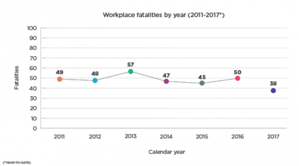 So far this year 38 Kiwis have been killed. The number killed and injured has stayed at a steady high despite changes to the health and safety laws in 2013 and 2015.