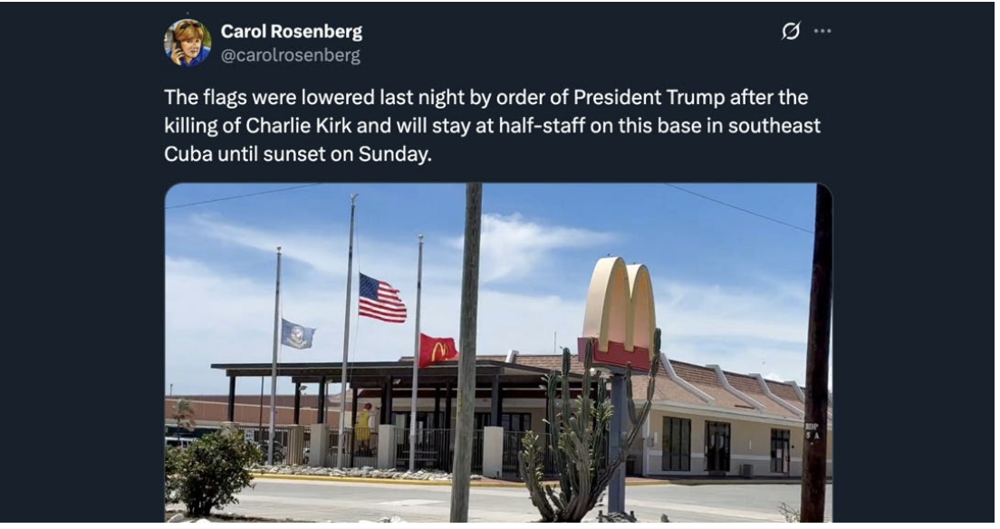 The Martyrdom of Charlie Kirk has come full circle as an Imperialist Corporate Military Industrial Complex wet dream fantasy when the Flag outside the McDonalds at the Guantanamo Bay torture prison is lowered to half mast…