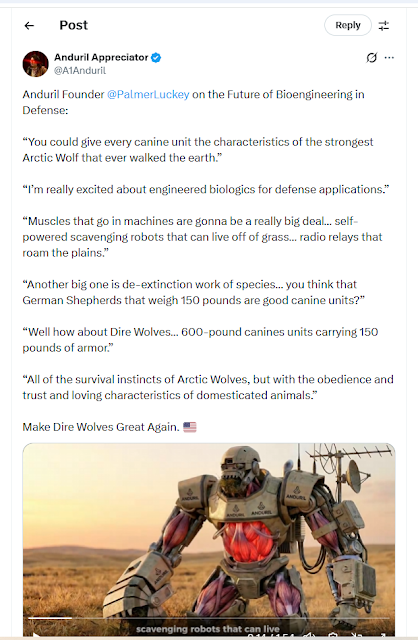 In this instance – Luckey, in a video extolling what he thinks might be good ideas for the future of warfare … has somehow managed to gush his way to his very own Fighting Uruk-Hai. These being the “engineered biologics” he’s on about – anthropomorphic or otherwise.