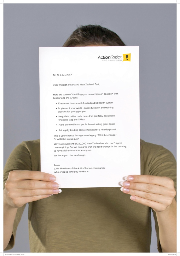 Crowdfunded newspaper ad urges NZ First to side with Labour – ActionStation