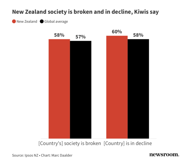Three in five respondents told Ipsos that New Zealand society was in decline and that the country is broken, aligning closely with results from overseas. This is the first time New Zealand has been included in this survey, which Ipsos has run elsewhere five times since 2016.