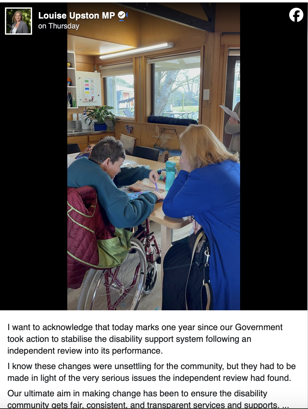 Members of the disabled community say a recent post by Disability Issues Minister Louise Upston celebrating progress is “out of touch” with families left struggling under funding changes.