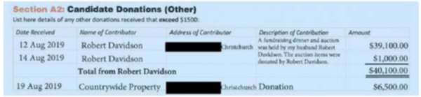 For example there is nothing in these proposals which would deal with the cynical, egregious behaviour of Christchurch mayor Lianne Dalziel who filed an election return which declared her husband as the donor for $1000 in auction goods (mainly bottles of wine) and the $39,100 raised from the auction.