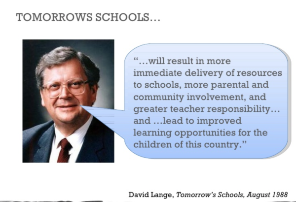The concept of a self-managing school was inherently flawed. Early on, an OECD inspector labelled Boards of Trustees ‘self-perpetuating oligarchies’. Their main role was to reproduce schools in the image of their own ambitions for their children. The governance model was flawed – far too many governance bodies to bring about evenness and fairness across the country, far too many inexperienced governors needing training (usually provided by the principal) and little logic in the system. We should not forget that the intention of those setting up the system was to make Boards the employers of teachers at each school, in order to break down the national collective bargaining system that has seen teachers, relatively speaking, maintain their pay and somewhat improve their conditions (compared to other sectors).