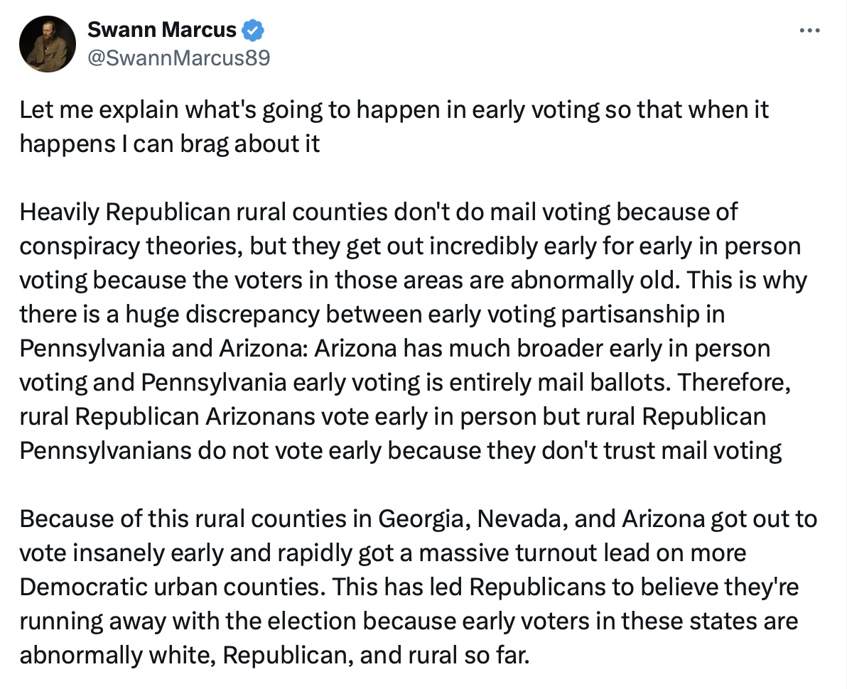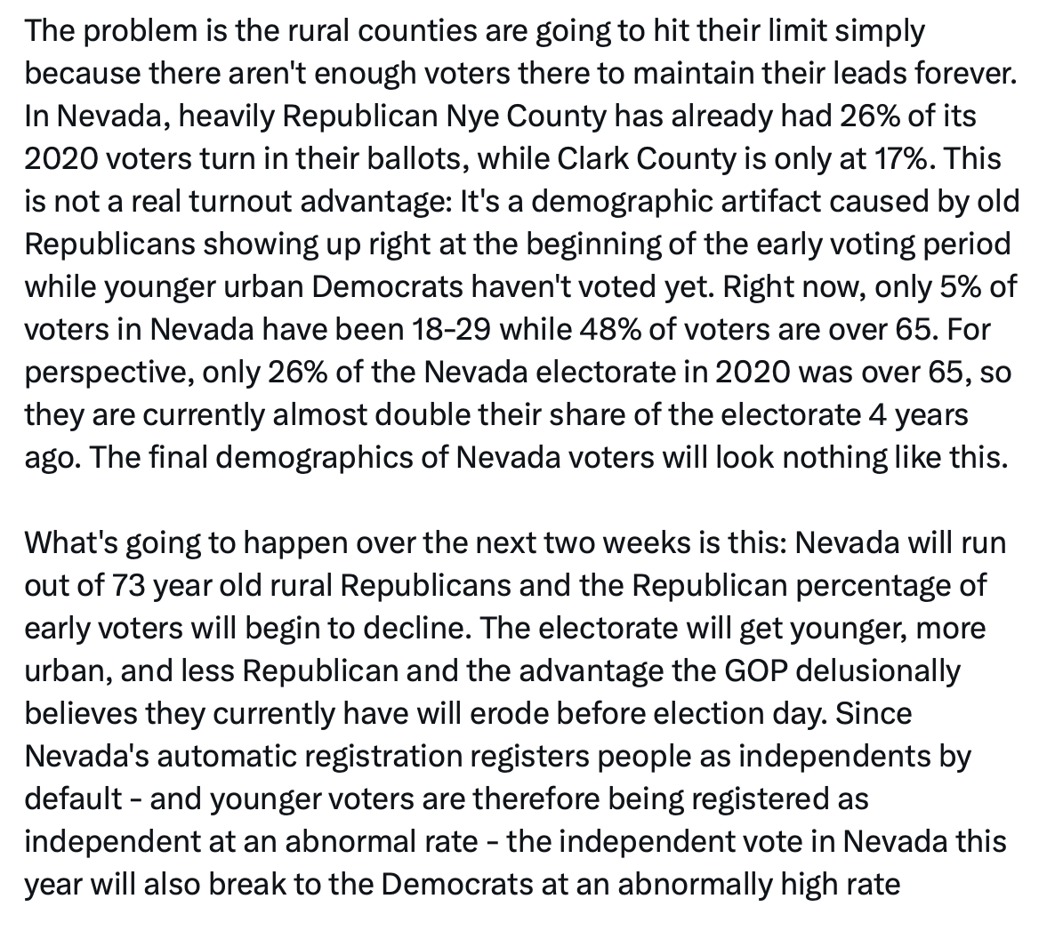 My thoughts at this stage are that the early voting trends don’t favour Republicans as much as they are claiming…