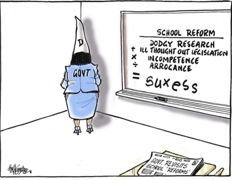 Mark also says that “there is an issue with the three Rs at the moment and that is where massive focus should be directed.” Yes and no, actually. The issue isn’t as bad as is being made out, but there’s no political advantage in admitting that. Yes, things can always be better and continual efforts need to be made to achieve this. How doing away with literacy specialist teachers, as the government has done, is going to assist with this is beyond me.