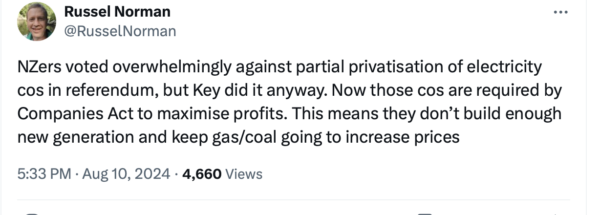 Big new thermal power station at Taupo being touted as likely meaning reduced power costs for hardworking kiwis. The PM actually had the gall to stand there and spout that nonsense. The breathless reporter repeated it. The news reader repeated it.