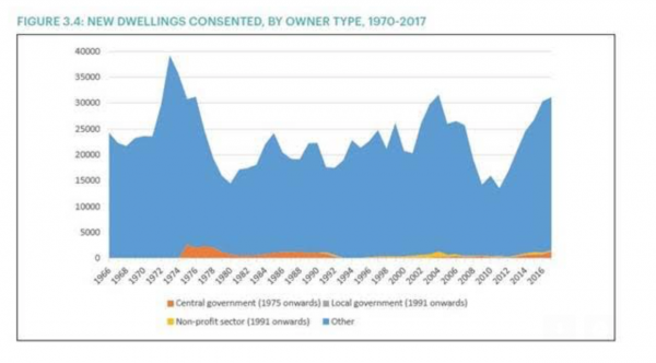 One figure, in particular, caught his attention. This was Figure 3.4 “New Dwellings Consented, By Owner Type, 1970-2017” (see below). It’s most notable feature, explained Dr Harris, was the extraordinary spike in new dwelling consents which followed the election of the Third Labour Government, led by Norman Kirk, in 1972.