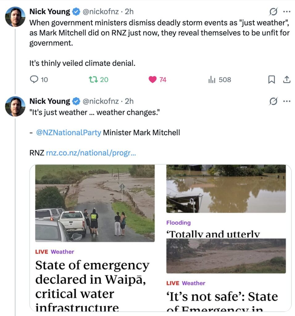 As floodwaters rise across Waikato and Wellington and boil water notices hit Christchurch suburbs, the Government’s refusal to connect extreme weather with climate policy becomes harder to defend. While ministers dodge the words “climate change,” communities are left to mop up, rebuild and brace for the next storm. The question isn’t whether this is climate-driven. The question is why the political class pretends it isn’t.