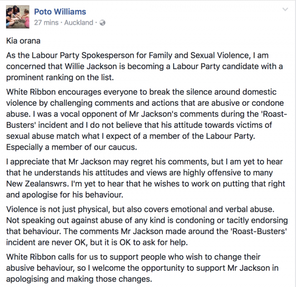 An extraordinary attack on Willie Jackson by Labour Party MP, Poto Williams, effectively insinuating Willie Jackson supports rapists is as self defeating as it is defamatory.