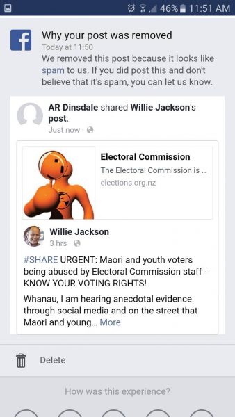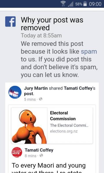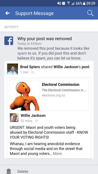 Adding to the concern that voter suppression seems to be inadvertently turning Maori and young voters away, it turns out that Facebook are suppressing Willie Jackson’s post on Maori and youth voter suppression allegations…
