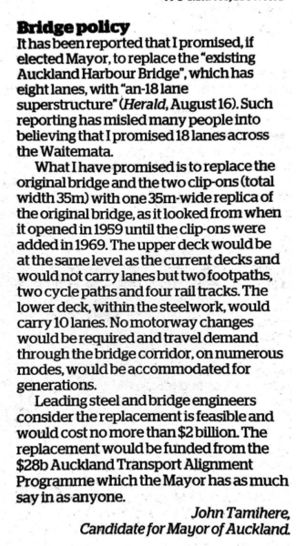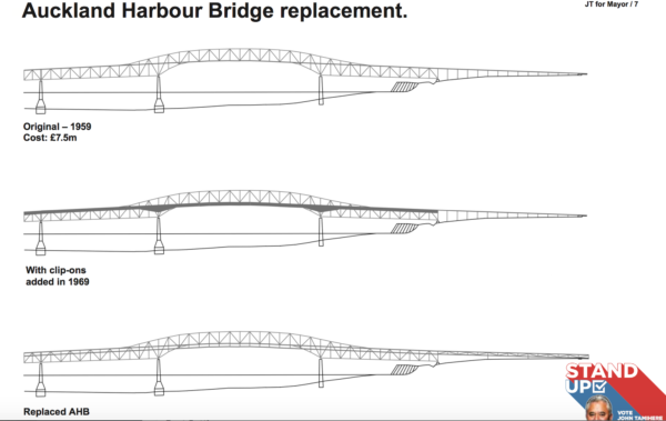 John Tamihere’s proposed harbour bridge replacement has been described in the media as having 18 lanes because it has 4 foot and cycle paths, 4 rail tracks and 10 lanes. We believe that even the Mayor was misled by such reporting into thinking and saying that John’s proposal is to build an 18 lane bridge. That is the same as thinking and saying that Queen Street has six lanes because it has two footpaths and four lanes.
