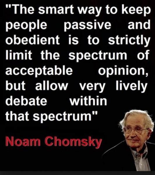 The great Noam Chomsky is exactly right in your image. Modern political “journalism” has disturbingly become more about controlling the narrative than unbiased reporting of the facts; this is best achieved by making the debate artificially narrow. Good on you for holding the so-called “free press” to account, regardless of their political slant.
