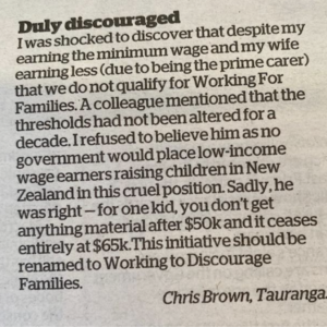 Increasingly it is not just those on benefits who cram into social agencies seeking help. Too many families in paid work face impossible clawbacks from low income levels. How ironic is this for a scheme that purports to be about helping working families with work incentives? As Chris Brown says in his letter, they lose a very high percentage of income they earn over the low fixed household income level at which their family assistance reduces. This is doubly cruel as any increases in income to compensate for inflation is simply taken back or creates debts that must be repaid.