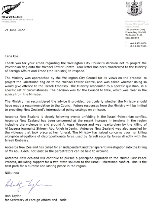 By way of background Palestine Solidarity Network Aotearoa wrote to all councils earlier this year requesting they fly the Palestinian flag. Wellington City Councillor Tamatha Paul organised for the Michael Fowler Centre to be lit up in Palestinian colours (because the council had no flagpole!) but this was abandoned when MFAT advice was received.