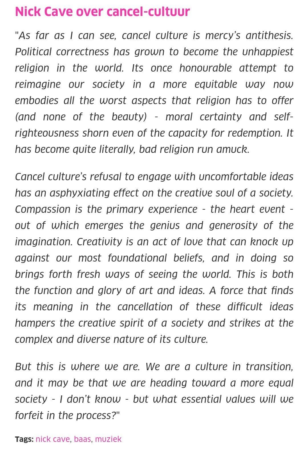 The mighty Nick Cave spells out the problem of cancel culture and how the identity politics woke are less progressive activists and more religious fanatics now…