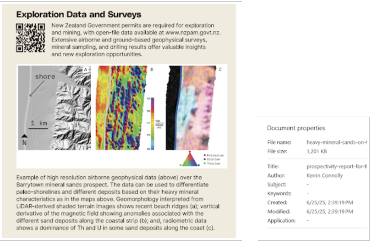 Which, curiously, are featured in an NZ Petroleum & Minerals ‘Prospectivity Report’ for the region, apparently created on the 25th of June this year – the brochure in question advising prospective exploration and/or mining permit applicants as to the existence of “radiometric data show[ing] a dominance of Th[orium] and U[ranium] in some sand deposits along the coast”.