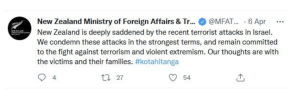 Why is it that the New Zealand government is keen to condemn violence against Israelis but never calls out the Israeli regime for the ongoing murder of Palestinians.