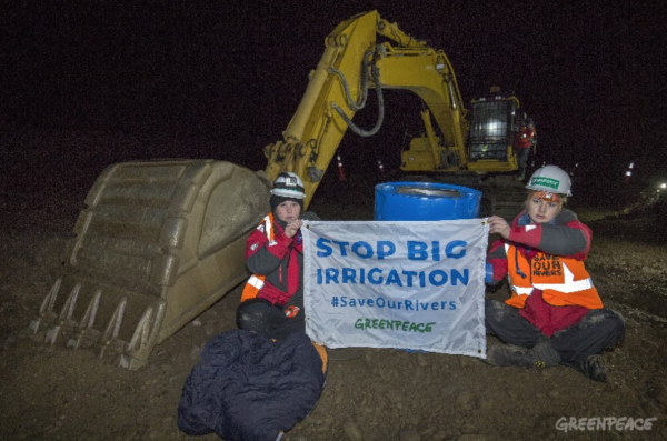 Speaking from the construction site Greenpeace Campaigner Genevieve Toop says: “We’re taking a stand today because big new irrigation schemes like Central Plains Water mean more cows, and more cows means more sick rivers.”