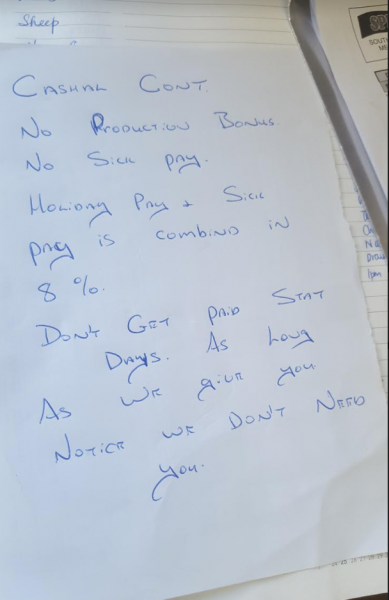 The workers at South Pacific Meat’s Malvern plant near the Burnham army camp have been given to Friday to sign the inferior deal, but in the meantime, they have been told their current conditions have been taken from them anyway and they are now regarded as casual workers. The attached photo shows the speaking notes from the supervisor who announced SPM’s brutal approach to bargaining.
