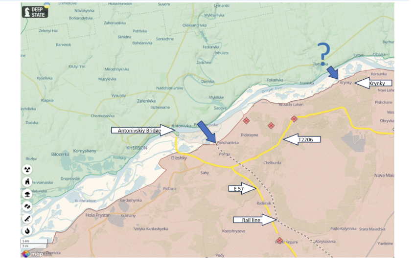 Further up the Dnipro there are also reports of another crossing near the village of Krynky. However, these have not yet been substantiated. The river crossings are an interesting operation, clearly designed to threaten the and T2206 and E57 highways that are essential to Russia’s supply lines in their part of Kherson Oblast. It is also possible that this operation is the start of a larger crossing. In last week’s column we noted the movement of Russian troops west, towards the Dnipro River. This week there are Russian reports of troops moving from reserve positions near Mariupol to reinforce this flank. So, it is likely that the Russians are concerned about a large crossing and are taking steps to mitigate that concern. But is it likely Ukraine will cross the river in large numbers?