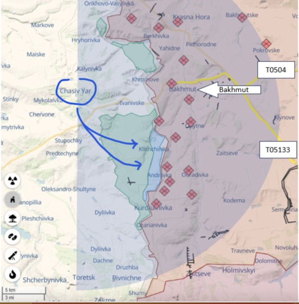 However, if Ukraine’s strategy is attrition, then this battle makes good sense and is achieving its results. This week Klischivka and Adrivka fell to Ukrainian forces who now dominate the north-south ridgeline overlooking Bakhmut. This position allows Ukrainian soldiers to direct artillery fire into the city and onto the roads highlighted in yellow on the map below, the T0513 and T0504. These roads are the main supply routes into the city are within range of Ukrainian artillery located near Chasiv Yar, represented by the shaded semi-circle. The Ukrainians on the high-ground and are well-supported logistically and with artillery fire from nearby Chasiv Yar, this village providing a well-fortified firm base for their operations.