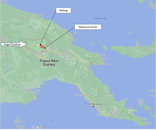 Enga Province is in the remote and mountainous high lands of Papua New Guinea. The terrain is difficult and the area is approximately 600km from the capital, Port Moresby. Fighting is concentrated along the road between the province’s capital Wabag and the village where government forces have established their base of operations, Wapenamanda. A distance of about 30km that is marked in red on the map below.