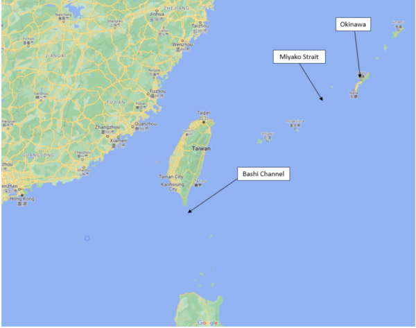 Chinese military aircraft and ships are regular visitors to the area and during the previous week conducted very large exercises involving the aircraft carrier Shandong and several escorts. The exercises were monitored by Taiwan and by the Japanese navy. Official sources told Reuters that more than 20 Chinese warships transited the Bashi Channel and Miyako Strait into the Pacific last Wednesday. See the map below.