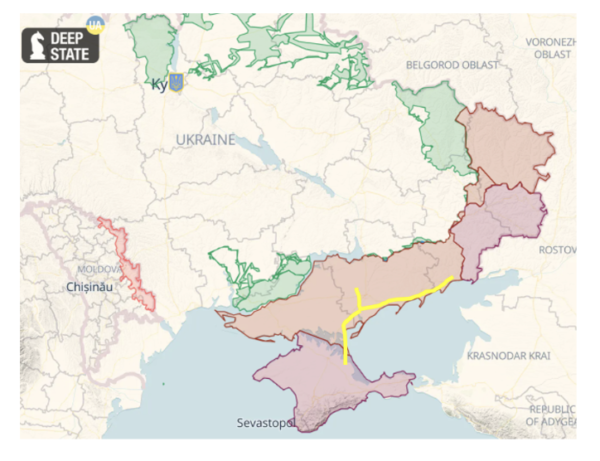 The first Principle of War is generally stated as ‘Selection and Maintenance of the Aim,’ a statement that means any military operation should start by defining the goal of the activity, so that planning, resources and supporting effort can be focussed on a single clearly defined objective. Ukraine has not published its objectives, so any statements made by commentators are based on their subjective analysis of the situation. Generally, commentators many of whom are ex-military, assess that Ukraine’s strategic goal is to capture Crimea because this peninsular dominates southern Ukraine and the Black Sea. If it is held by Russia, Ukraine is vulnerable. The best way to drive the Russians out of Crimea is to starve them out by severing the network of road and rail lines that run along the Sea of Azov’s northern shore. See the yellow line on the map below. If the Kerch Bridge is destroyed and the Crimean Land Bridge cut, the peninsular is isolated and cannot easily be resupplied making it untenable.