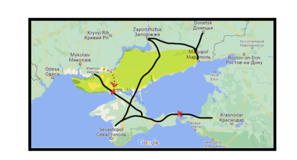 In summary, the south-east coast of Ukraine currently held by Russia is in a precarious position because its defenders are isolated from logistic support and suffering from low morale. Ukraine’s interdiction of the rail network at Kerch makes movement of logistics west into the area difficult and the recent capture of Kherson means Ukraine can further impede Russia’s ability to supply its soldiers. The area is ripe for exploitation and if it falls will break the ‘Crimean land bridge’ and isolate Crimea.