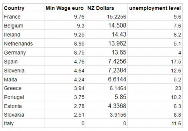 The countries with a higher minimum wage are actually more likely to have lower rate unemployment than those with a lower rate. Italy has no minimum wage, but still had an unemployment rate of 11.6%, whereas the Nederlands with a minimum wage just under $14 NZD had an unemployment level of 5.1%. The parts of the EU with the best protections for workers tend to fare better, not worse.