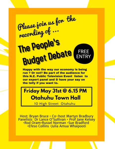 I am hosting New Zealand Public Television’s first Budget and Economy Event at the Otahuhu Town Hall Friday May 31st @ 6.15 pm