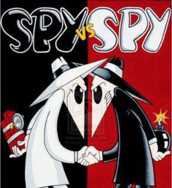 One of my favourite publications when I was a student was MAD magazine . What appealed to me was ability of their cartoonists to point up ludicrous political behaviour and during the Cold War with Russia a wordless comic strip called Spy vs Spy began to appear in which one spy all in white constantly came up against a spy all in black. As each tried to out fox each other the outcome was often disastrous for both.
